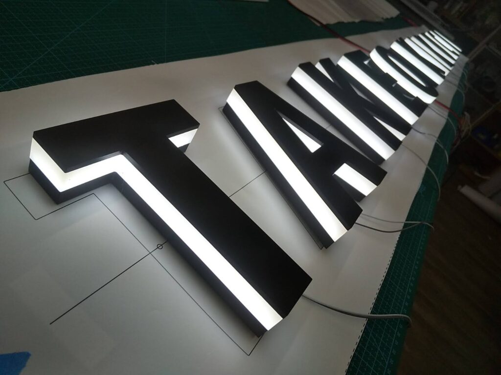 消灯時は金属やアクリルの立体的な文字サインとして機能。点灯時は側面から光が漏れ、文字に奥行きと立体感が加わります。