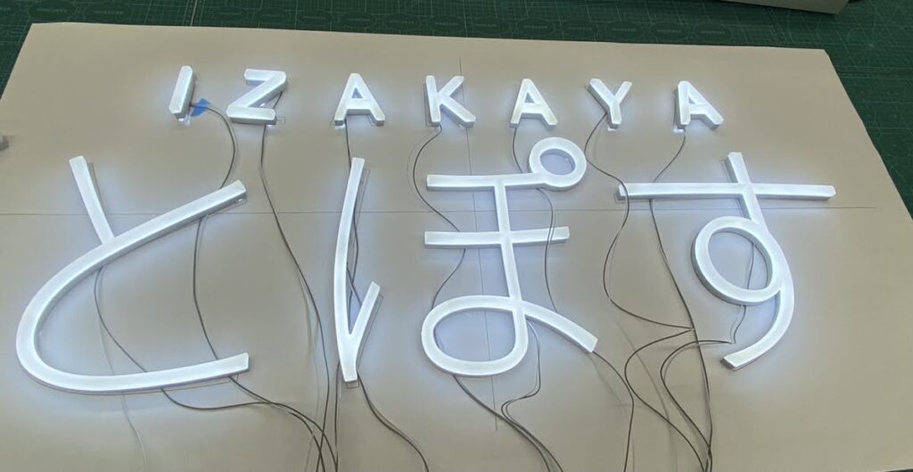 ネオン風LEDサインは、従来のガラスネオン管に比べて省電力・長寿命・割れにくいという特長があります。アクリル素材を文字やロゴの形に精密に削り出し、内部にLEDを組み込むことで、ネオンのような柔らかな発光を再現します。居酒屋・バー・カフェなど、雰囲気を重視する飲食店に特に人気です。