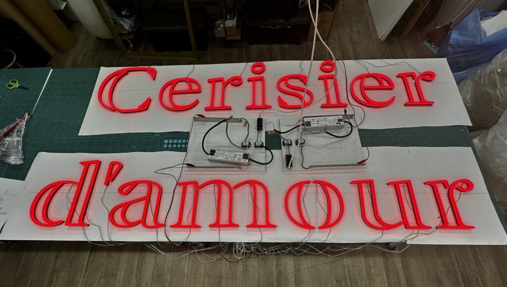 パティスリー・ケーキ屋・洋菓子店にぴったりの大型ネオン風LEDサインをご紹介します。横幅約3.8メートルのフランス語テキストを赤色カラーアクリルで表現し、エレガントなセリフ体フォントが洋菓子店の上品な雰囲気を引き立てます。このような大型サインも製作可能です。